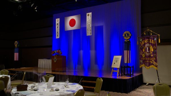 六甲ベイシェラトンホテルで開催しました。弊社は音響・照明・進行・司会者派遣・アトラクションを担当いたしました。LEDがジョーゼットを染めています